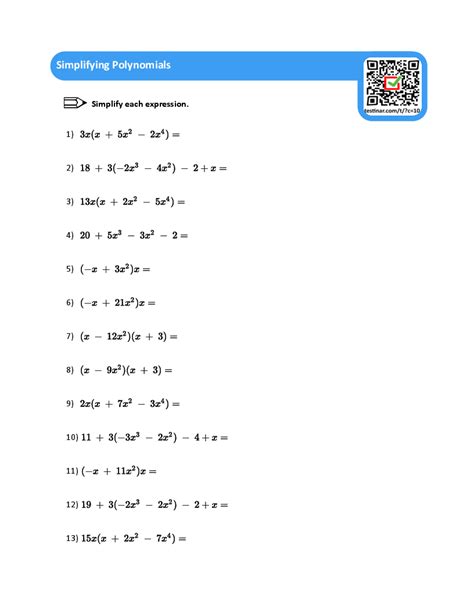 Simplifying Polynomials Worksheet. Simplify each polynomial below by combining ‘like’ terms. Web if you were asked to simplify the polynomial, you should have a list of all unlike term like shown in the video: